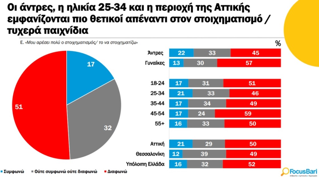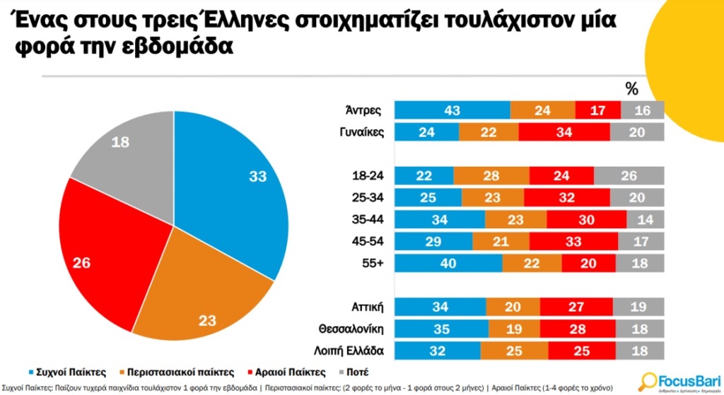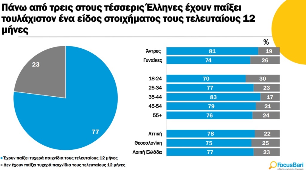 Περισσότεροι από 1/3 Έλληνες είναι ενεργοί και συστηματικοί παίκτες τυχερών παιχνιδιών και πάνω από τρεις στους τέσσερις Έλληνες έχουν «παίξει» τουλάχιστον μια φορά τους τελευταίους 12 μήνες, είτε αυτό είναι αθλητικό στοίχημα, λαχείο ή άλλο παιχνίδι, είτε online, είτε δια ζώσης, σύμφωνα με τη νέα Πανελλαδική Έρευνα της Focus Bari που εστιάζει στη δημοτικότητα και τις συνήθειες των Ελλήνων σχετικά με τα στοιχήματα / λαχεία / τυχερά παιχνίδια.