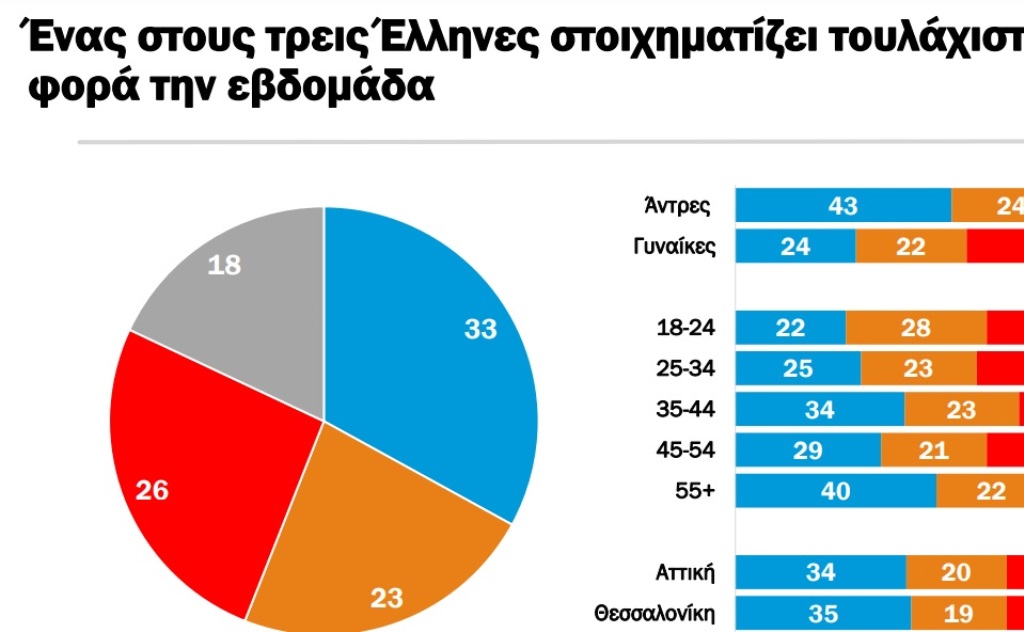 Ένας στους τρεις δηλώνει στην έρευνα ότι στοιχηματίζει τουλάχιστον μία φορά την εβδομάδα. Όπως αναμένεται στους άνδρες το ποσοστό είναι στο 43% ενώ αίσθηση προκαλεί και το 24% στις γυναίκες.