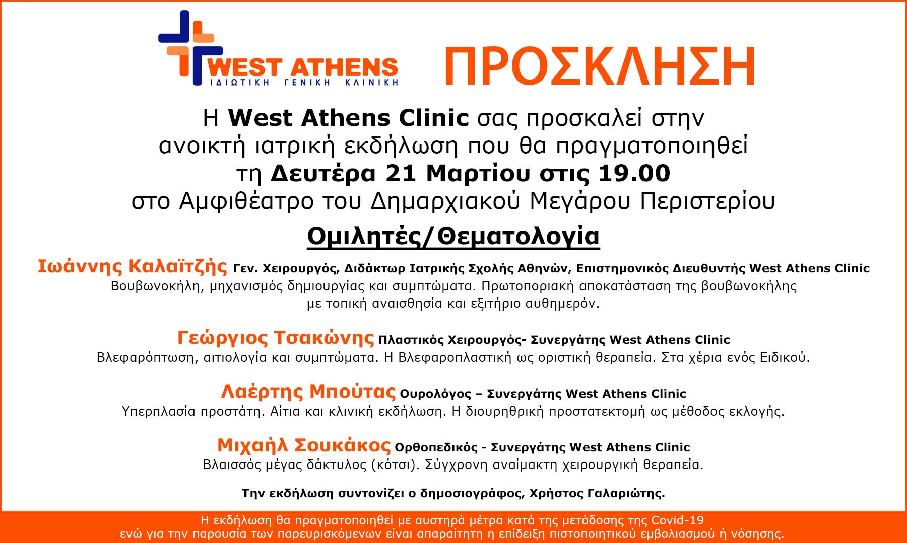 Μια ιδιαίτερα ενδιαφέρουσα εκδήλωση διοργανώνει η West Athens Clinic τη Δευτέρα 21 Μαρτίου 2022 στο Δημαρχείο Περιστερίου.