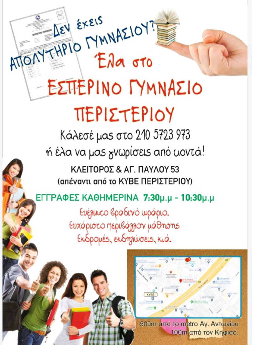 Από την Πέμπτη 1 Σεπτεμβρίου 2022 έχουν ξεκινήσει οι νέες εγγραφές, οι μετεγγραφές και οι ανανεώσεις εγγραφής μαθητών και μαθητριών παρελθόντων ετών στο Εσπερινό Γυμνάσιο Περιστερίου, το οποίο συστεγάζεται με το 3ο ΓΕ.Λ. Περιστερίου στην οδό Κλείτορος και Αγίου Παύλου 53 (έναντι ΚΥΒΕ Περιστερίου) μόλις 500 μέτρα από το σταθμό του μετρό “Άγιος Αντώνιος “.