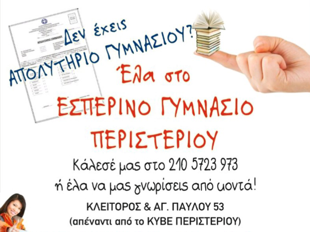 Από την Πέμπτη 1 Σεπτεμβρίου 2022 έχουν ξεκινήσει οι νέες εγγραφές, οι μετεγγραφές και οι ανανεώσεις εγγραφής μαθητών και μαθητριών παρελθόντων ετών στο Εσπερινό Γυμνάσιο Περιστερίου, το οποίο συστεγάζεται με το 3ο ΓΕ.Λ. Περιστερίου στην οδό Κλείτορος και Αγίου Παύλου 53 (έναντι ΚΥΒΕ Περιστερίου) μόλις 500 μέτρα από το σταθμό του μετρό “Άγιος Αντώνιος “.