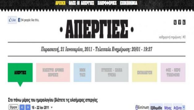 Έτσι λοιπόν με αφορμή τις απεργίες, δημιουργήθηκαν διάφορα site όπως το apergies.gr και το apergia.gr μέσα από τα οποία κάθε χρήστης μπορεί να ενημερωθεί για όλες τις απεργίες της ημέρας κι έτσι να είναι προετοιμασμένος όταν ξεκινήσει να πάει στη δουλειά του.