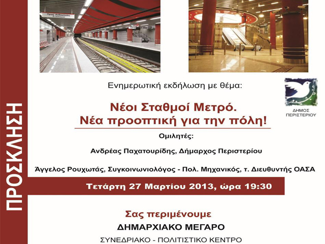 Ο Δήμος Περιστερίου σας προσκαλεί στην ενημερωτική εκδήλωση με θέμα: «Νέοι Σταθμοί Μετρό. Νέα προοπτική για την πόλη», την Τετάρτη 27 Μαρτίου 2013, ώρα 7:30 μ.μ., στο πολιτιστικό – συνεδριακό κέντρο του Δημαρχιακού Μεγάρου (είσοδος Εθν. Αντιστάσεως και Καραθεοδωρή).