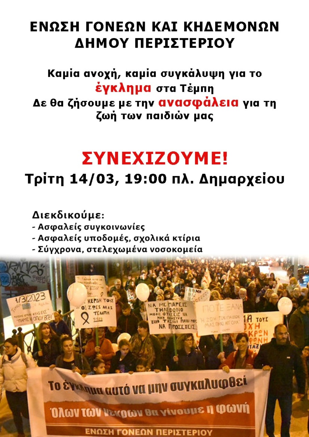 Σε νέα συγκέντρωση διαμαρτυρίας καλεί η Ένωση Γονέων Περιστερίου λόγω της τραγωδίας που σημειώθηκε στα Τέμπη, με το πολύνεκρο σιδηροδρομικό δυστύχημα.