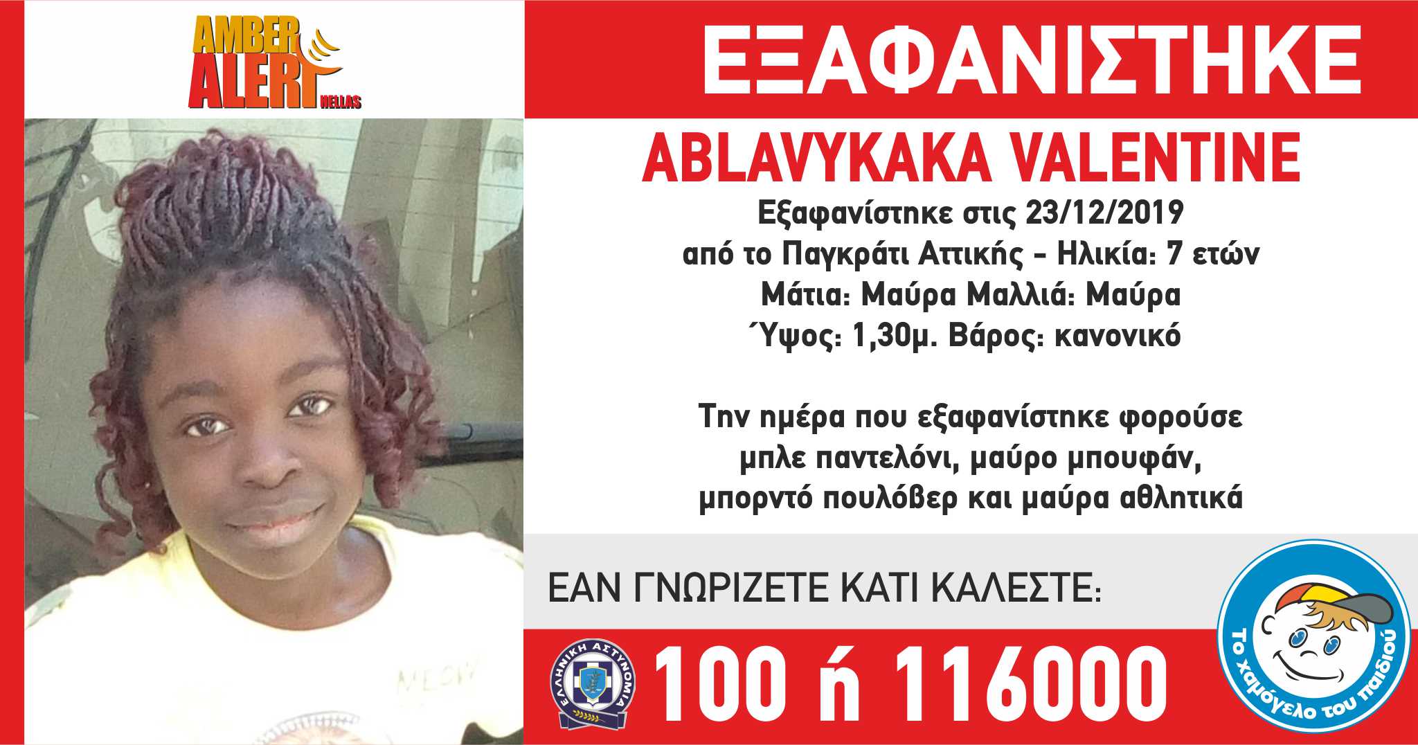 Βρέθηκε η 7χρονη μαθήτρια με καταγωγή από το Κονγκό, που είχε εξαφανιστεί στις 23 Δεκεμβρίου του 2019 στο Παγκράτι.