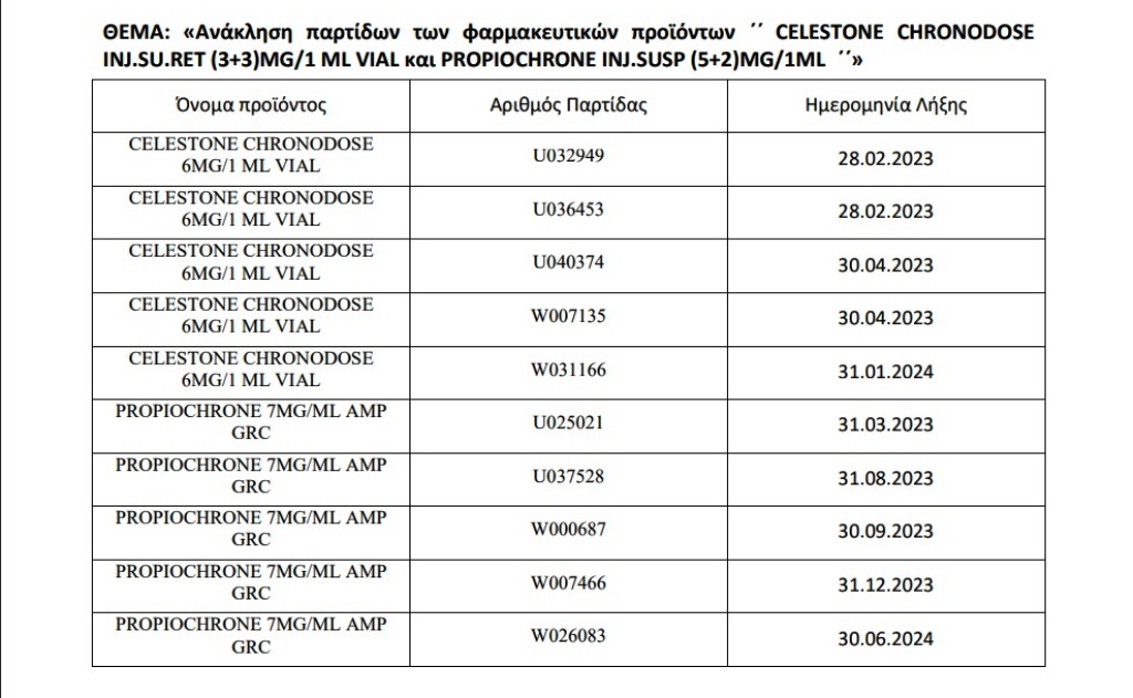 Αναλυτικά τα ανακληθέντα φάρμακα, ο αριθμός παρτίδας και η ημερομηνία λήξης για το καθένα: