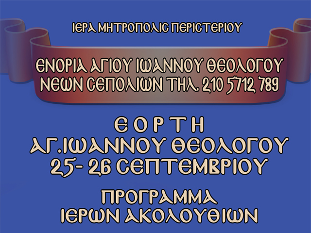 Στις 25 και 26 Σεπτεμβρίου, Παρασκευή και Σαββάτο πανηγυρίζει ο Ιερός Ναός Αγ. Ιωάννου Θεολόγου Νέων Σεπολίων.