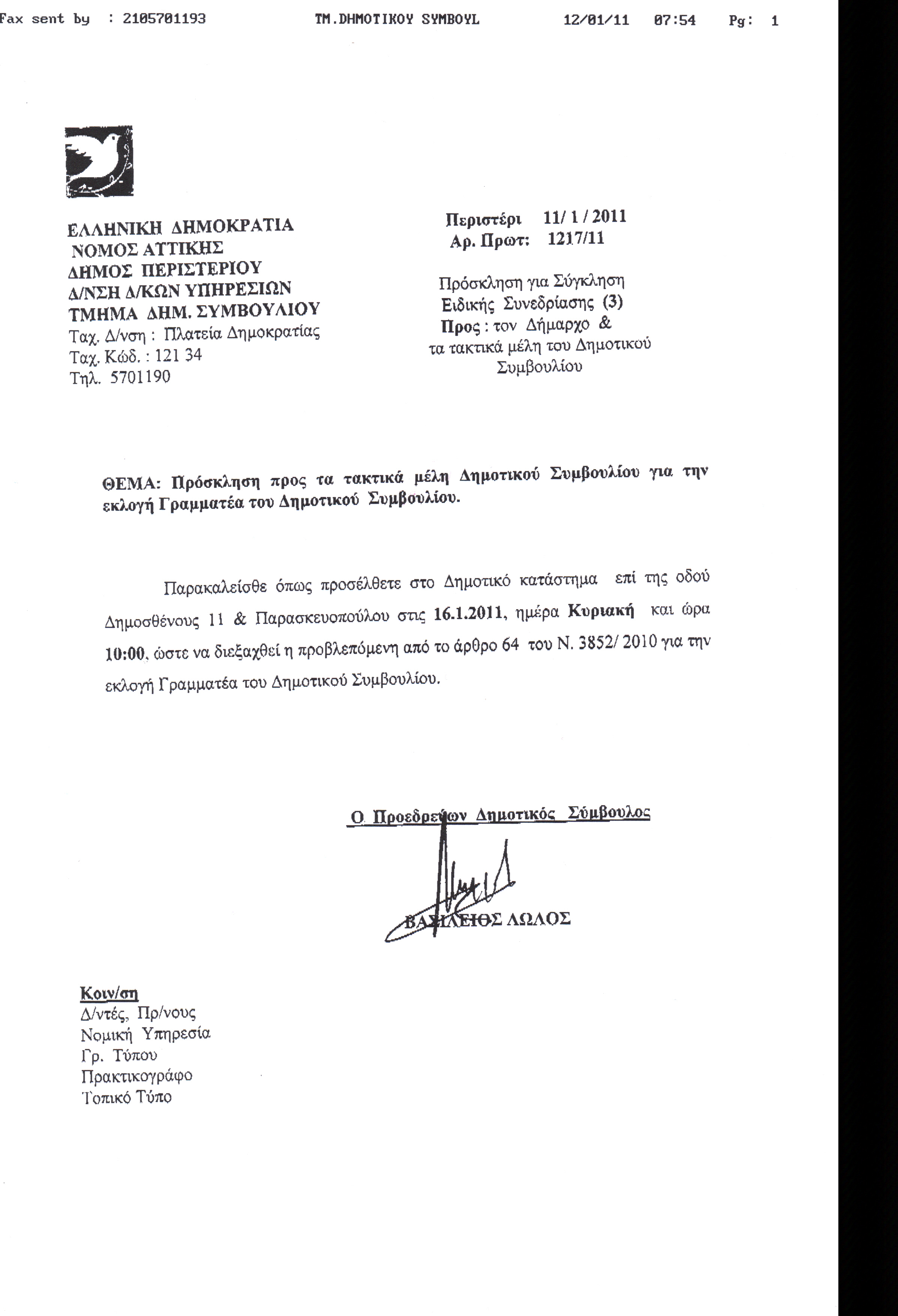Μετά την ακύρωση της εκλογής Γραμματέα του Δημοτικού Συμβουλίου Δήμητρα Τσιαμούλη από την Αποκεντρωμένη Διοίκηση Αττικής, καλούνται εκ νέου οι Δημοτικοί Σύμβουλοι από τον Προεδρεύων Δημοτικό Σύμβουλο Βασίλη Λώλο την Κυριακή 16 Ιανουαρίου 2011 και ώρα 10:00 για τη διαδικασία των Δημαιρεσιών στην αίθουσα συνεδριάσεων της «Ξυλοτεχνίας».
