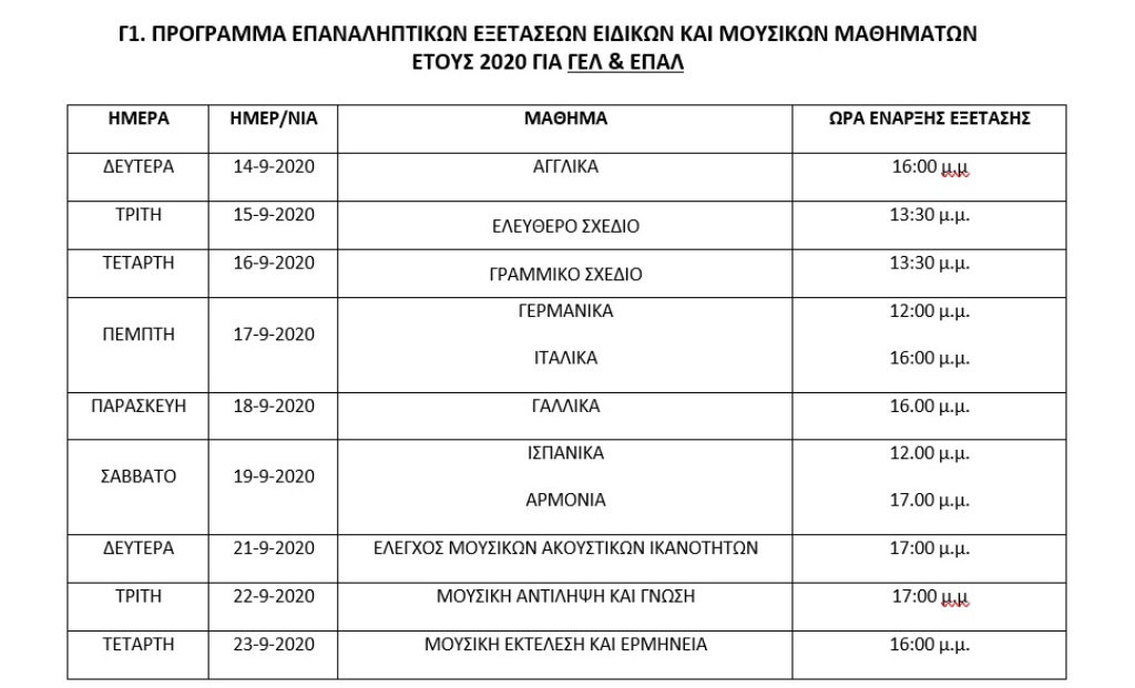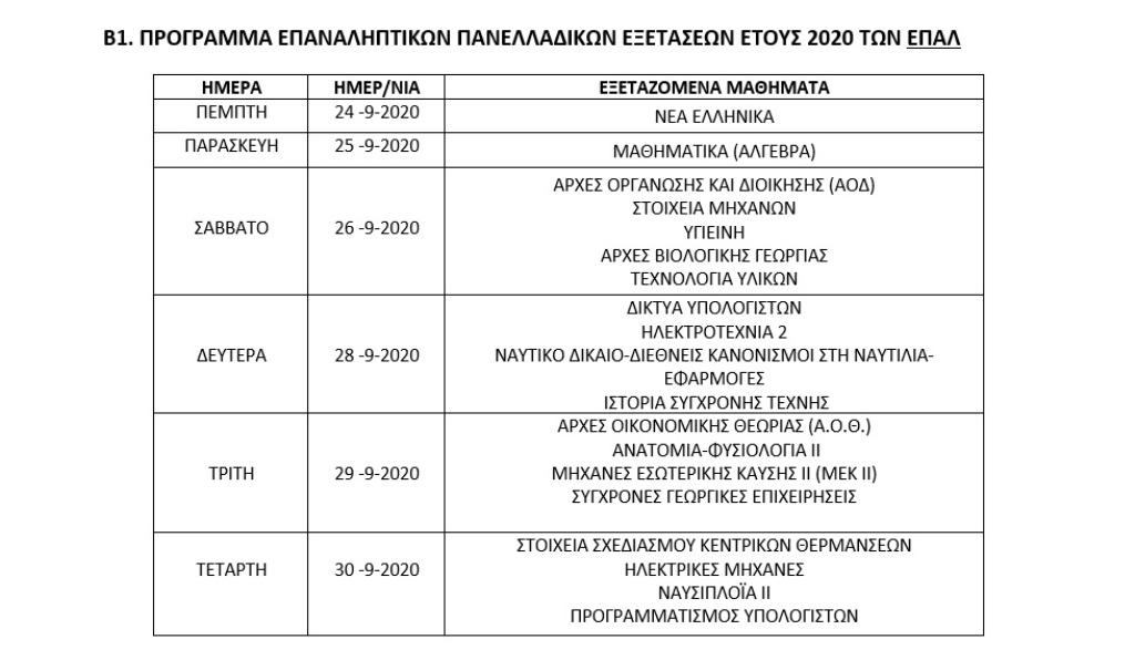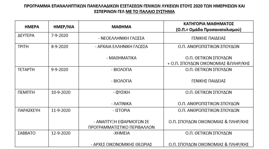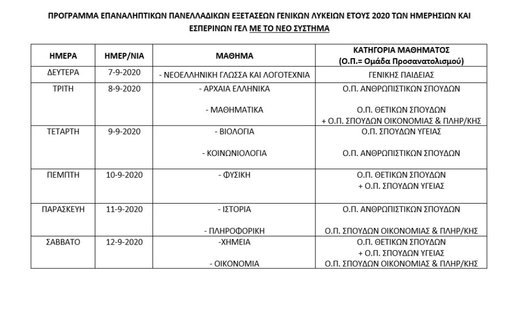 Οι επαναληπτικές πανελλαδικές εξετάσεις ξεκινούν στις 7 Σεπτεμβρίου για τα Γενικά Λύκεια και τους Έλληνες του εξωτερικού και στις 24 Σεπτεμβρίου για τα Επαγγελματικά Λύκεια.
