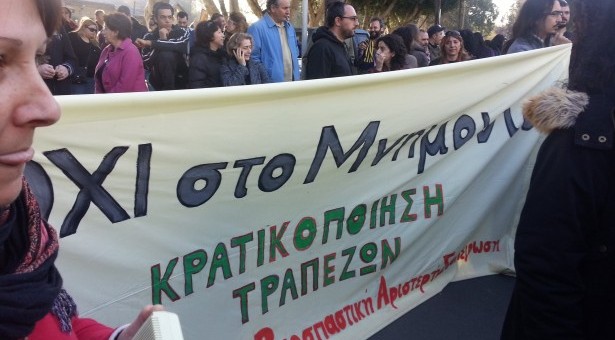 Ανάμεσα στους συγκεντρωμένους βρίσκονται εργαζόμενοι της λαϊκής τράπεζας που διαμαρτύρονται για τις δραματικές εξελίξεις και το μέλλον της τράπεζας.
