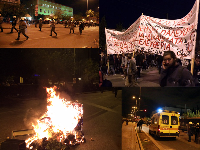 Όπως μεταδίδει το ΑΜΠΕ, οι δυνάμεις των ΜΑΤ απώθησαν τους διαδηλωτές κάνοντας χρήση χημικών και χειροβομβίδων κρότου λάμψης, όταν ομάδα που αποκόπηκε από τον κύριο όγκο της πορείας κινήθηκε κατά των αστυνομικών.