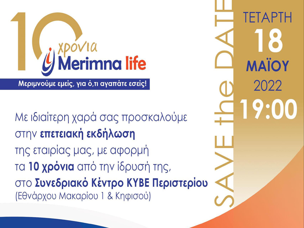 Η εταιρία Merimna life, με έδρα το Περιστέρι, στο πλαίσιο του εορτασμού των 10 χρόνων λειτουργίας της διοργανώνει επετειακή εκδήλωση, την Τετάρτη 18 Μαΐου 2022 στις 19:00, στο Συνεδριακό Κέντρο ΚΥΒΕ Περιστερίου (Εθνάρχου Μακαρίου 1 & Κηφισού).