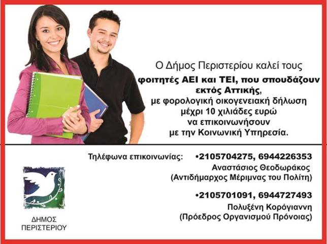 Ο Δήμος Περιστερίου καλεί τους φοιτητές ΑΕΙ – ΤΕΙ, που σπουδάζουν εκτός της Αττικής, με οικογενειακή φορολογική δήλωση μέχρι και 10 χιλιάδες ευρώ να επικοινωνήσουν με την Κοινωνική του Υπηρεσία.