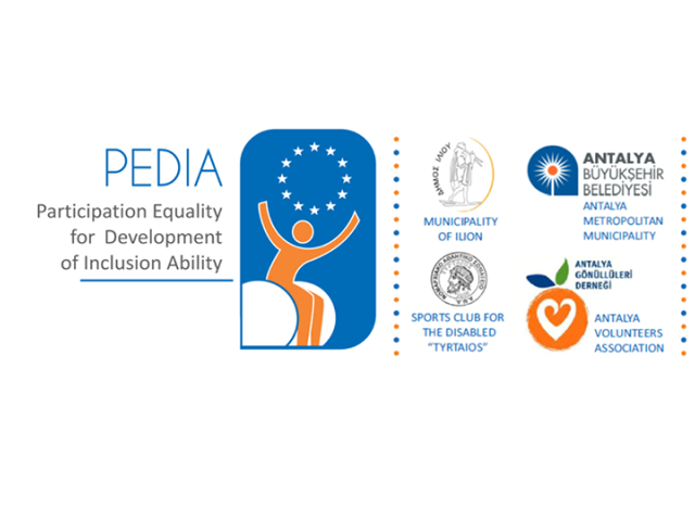 Στο πλαίσιο του προγράμματος PEDIA: Ισότητα Συμμετοχής για την Ανάπτυξη Ικανότητας Ένταξης, το Αθλητικό Σωματείο ΑμΕΑ “Τυρταίος” και ο Δήμος Ιλίου θα υποδεχτούν τον Δήμο Αττάλειας της Τουρκίας και την εθελοντική ομάδα ΑμεΑ του Δήμου. Ο σκοπός της επίσκεψης θα είναι ένα πενταήμερο εργαστήριο ανταλλαγής καλών πρακτικών σε θέματα συμμετοχικότητας των ΑμεΑ στην πολιτική ζωή σε τοπικό, εθνικό και Ευρωπαϊκό επίπεδο καθώς και θέματα προσβασιμότητας στην πόλη.