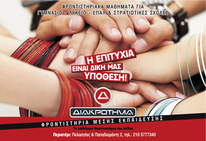 Το 1997, μαζί με μια ομάδα έμπειρων και καταξιωμένων καθηγητών στο χώρο τους, δημιουργήσαμε το πρώτο κέντρο Φροντιστηριακής Εκπαίδευσης ΔΙΑΚΡΟΤΗΜΑ. Φιλοδοξία μας ήταν και είναι η παροχή μαθημάτων φροντιστηριακής υποστήριξης στους μαθητές μας με μοναδικό στόχο τη μελλοντική τους επιτυχία.