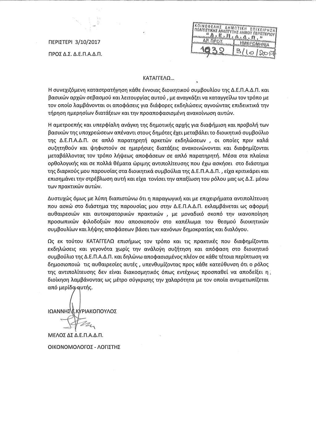 «Με την γνωστοποίηση της επιστολής αυτής προς το ΔΣ της Δ.Ε.Π.Α.Δ.Π. και την κοινοποίηση της προς τους δημότες, είναι πλέον ορατός ο δρόμος της κριτικής και της επιχειρηματολογίας, η αντιπολίτευση εκφράζεται με τρόπο όπως αυτός αρμόζει στον ρόλο της. Η διαδικασία συνεχούς και δημιουργικής αντιπολίτευσης μόλις ξεκίνησε, σκοπός της είναι ο επαναπροσδιορισμός των ευθυνών της, όπως και η λειτουργία της καθώς μέσα από αυτή επισημαίνονται τα κακώς κείμενα της σημερινής διοίκησης», αναφέρει το μέλος της Δ.Ε.Π.Α.Δ.Π. Ιωάννης Κυριακόπουλος.