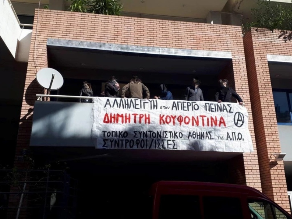 Ανέβηκαν στον πρώτο όροφο κρατώντας ένα αναμμένο καπνογόνο, κρέμασαν πανό στο μπαλκόνι, παρέμειναν λίγα λεπτά και αποχώρησαν πρoτού φτάσει στο σημείο η αστυνομία.