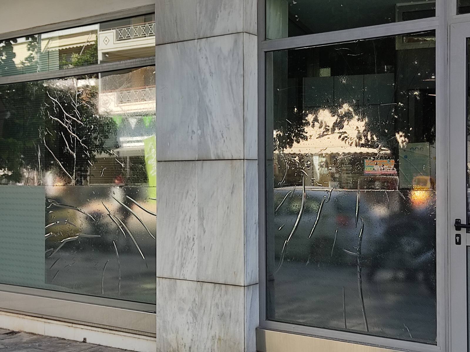 Εμφανή είναι τα χτυπήματα στη τζαμαρία καταστήματος τράπεζας στο Περιστέρι από επίθεση με βαριοπούλες.