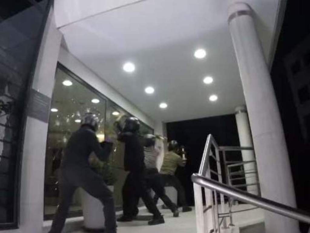 Όπως φαίνεται και στο βίντεο που έδωσαν στη δημοσιότητα τα μέλη του Ρουβίκωνα, τέσσερα άτομα έφθασαν έξω από τα γραφεία κρατώντας βαριοπούλες. Έσπασαν μέρος της τζαμαρίας και στη συνέχεια προσπάθησαν να σπάσουν και τα τζάμια στις πόρτες.