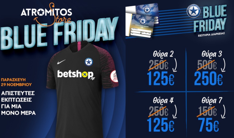 Παρασκευή 29 Νοεμβρίου 2019. Μέρα προσφορών, μέρα Blue Friday στο Atromitos store του Δημοτικού Σταδίου Περιστερίου με απίστευτες ευκαιρίες σε προϊόντα του Ατρομήτου και εισιτήρια διαρκείας.