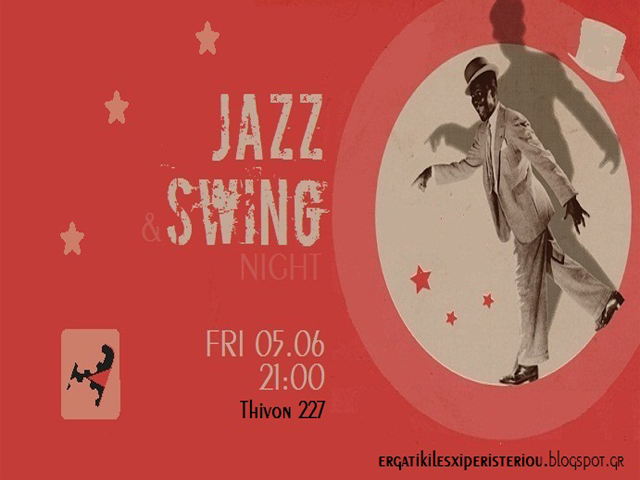 Την Παρασκευή 5/6/2015 μετά τις 21.00.Την Παρασκευή μετά τις 9 πίνουμε το ποτό μας στην ταράτσα της Λέσχης με Jazz, Swing και Electro-swing ήχους.ΕΡΓΑΤΙΚΗ ΛΕΣΧΗ ΠΕΡΙΣΤΕΡΙΟΥΘΗΒΩΝ 227