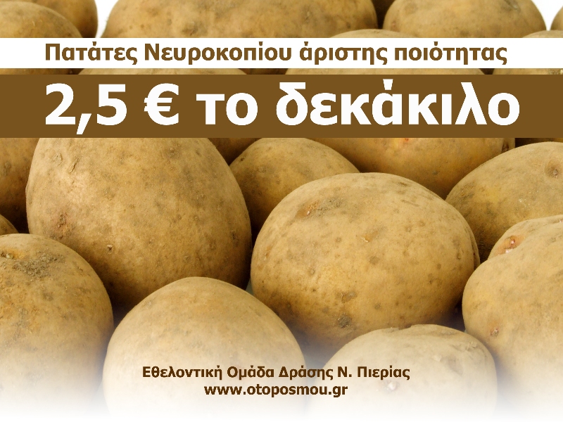 Η Εθελοντική Ομάδα Δράσης Νομού Πιερίας οργάνωσε τη μαζική πώληση πατάτας μέσω του διαδικτύου καταργώντας τους μεσάζοντες, με αποτέλεσμα να πουληθούν συνολικά 24 τόνοι πατάτας Νευροκοπίου σε 530 οικογένειες κατοίκων της ευρύτερης περιοχής της Κατερίνης, σε τιμή κόστους (0,25 ευρώ το κιλό).