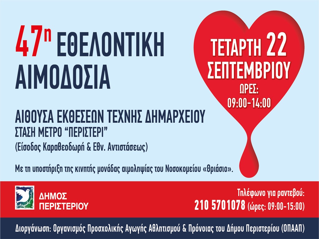 Ο Δήμος Περιστερίου με ανακοίνωση του ενημερώνει πως ο Οργανισμός Προσχολικής Αγωγής Αθλητισμού και Πρόνοιας διοργανώνει την 47η Εθελοντική Αιμοδοσία, με τη υποστήριξη της κινητής μονάδας αιμοληψίας του Νοσοκομείου «Θριάσιο».