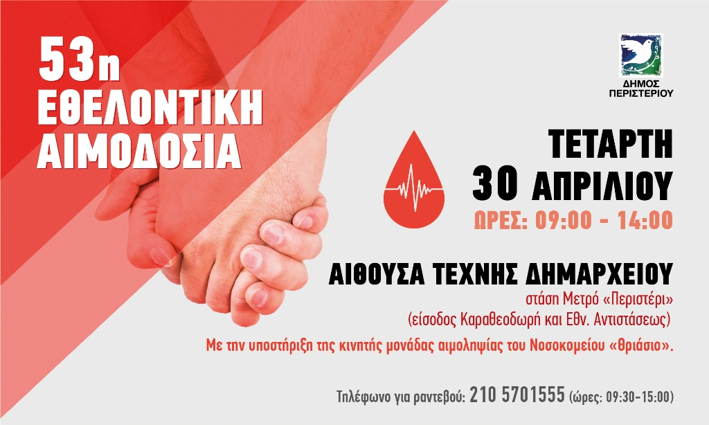 O Δήμος Περιστερίου διοργανώνει την 53η Εθελοντική Αιμοδοσία, με την υποστήριξη της κινητής μονάδας αιμοληψίας του Νοσοκομείου «Θριάσιο».