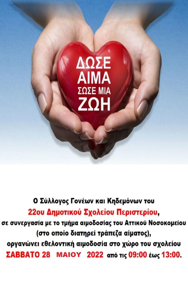 Εθελοντική αιμοδοσία διοργανώνει ο Σύλλογος Γονέων και Κηδεμόνων του 22ου δημοτικού σχολείου Περιστερίου.