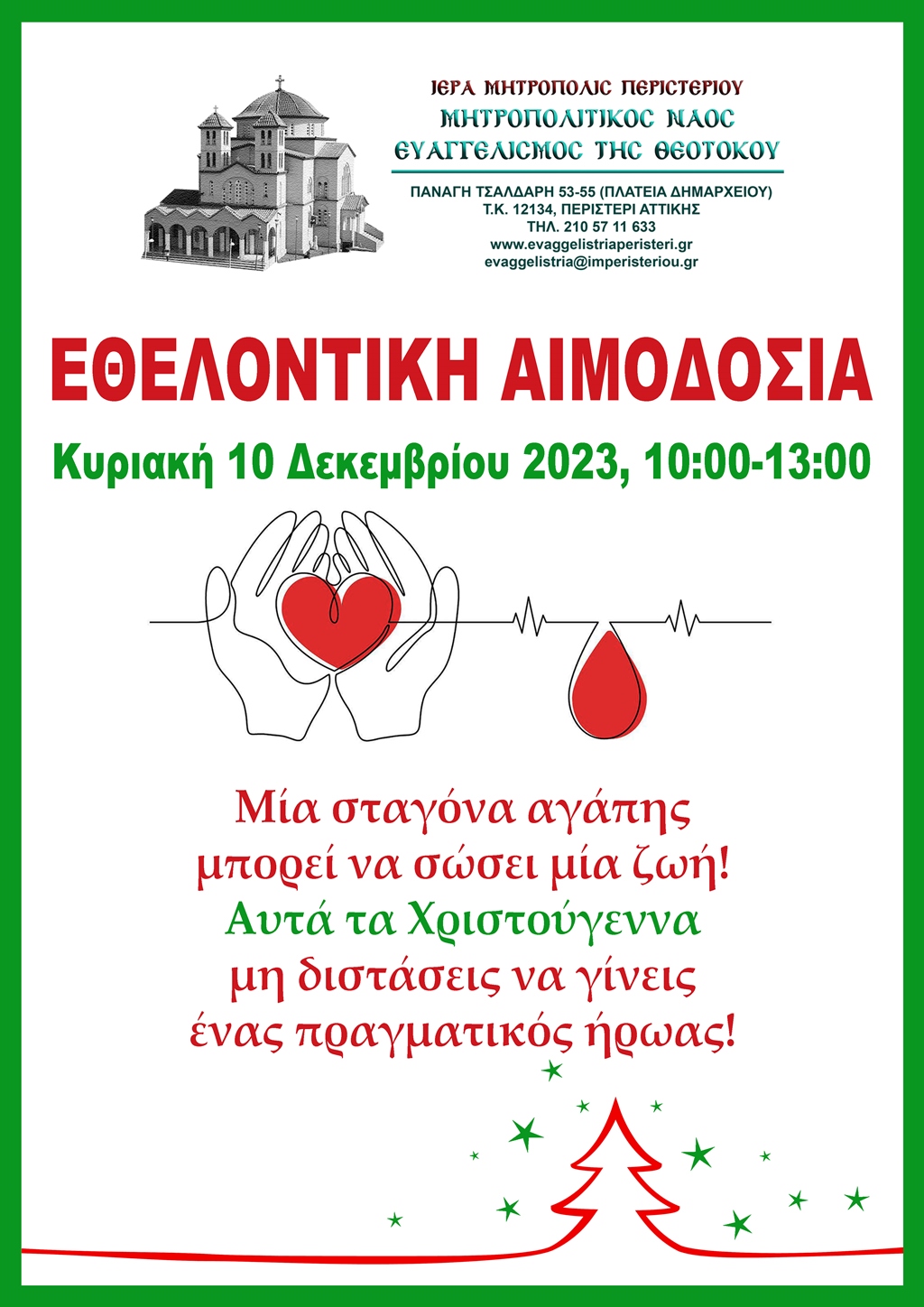 Εθελοντική αιμοδοσία διοργανώνει ο Μητροπολιτικός Ιερός Ναός «Ευαγγελισμός της Θεοτόκου» Περιστερίου.