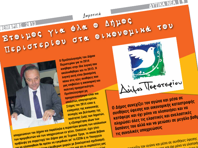 Ο Προϋπολογισμός του Δήμου Περιστερίου για το 2014 κινήθηκε στην ίδια λογική που ακολουθήθηκε και το 2013. Η λογική αυτή είναι βασισμένη πάνω στις νέες συνθήκες που μας επιβάλλει η οικονομική και πολιτική πραγματικότητα.