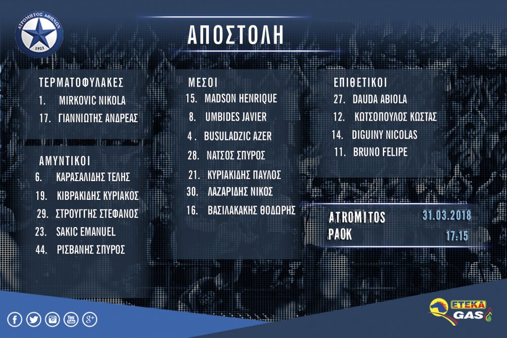 Εκτός αποστολής από τον Νταμίρ Κάναντι έμειναν οι τρεις δανεικοί (Γιαννούλης, Χατζηισαΐας, Ουάρντα) λόγω της σχετικής συμφωνίας των δύο ομάδων με τον Αυστριακό να γνωρίζει τους απόντες εξ αρχής.
