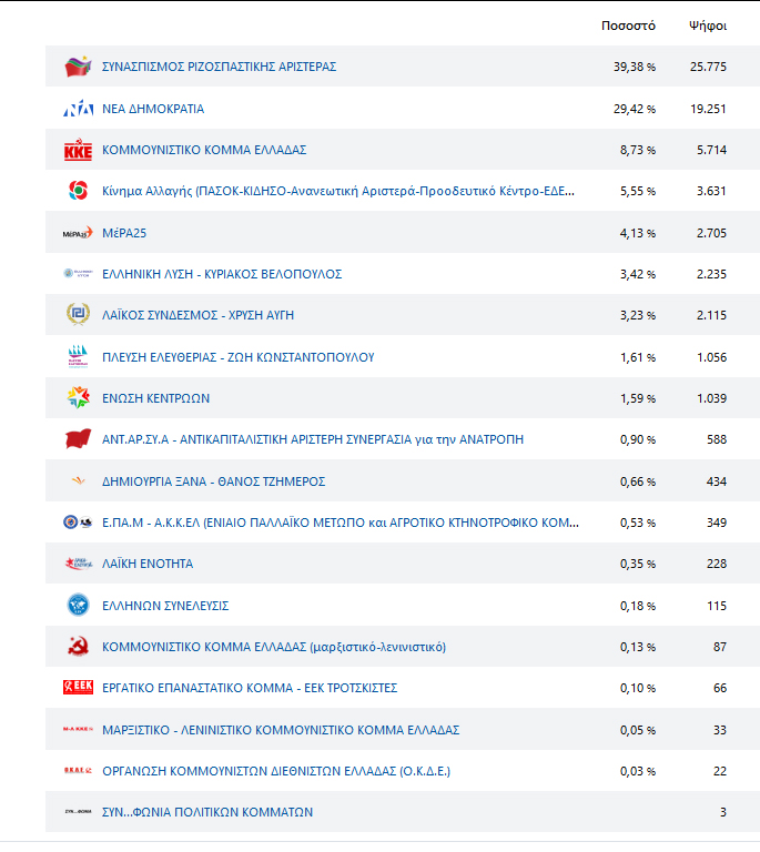 Ποσοστό άνω του 3% σημείωσαν ακόμα το ΜΕΡΑ25(4,13%), η ΕΛΛΗΝΙΚΗ ΛΥΣΗ(3,42%) και η ΧΡΥΣΗ ΑΥΓΗ(3,23%) που έμεινε εκτός Βουλής.