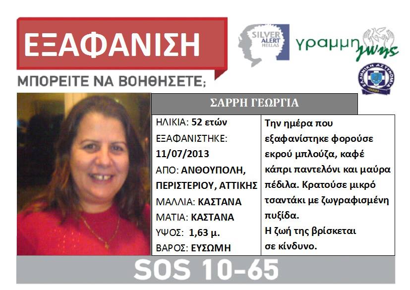 Η 52χρονη Σαρρή Γεωργία από την Ανθούπολη Περιστερίου εξαφανίστηκε στις 11 Ιουλίου 2013 και έχει εκδοθεί Silver Alert για τον εντοπισμό της κατόπιν εισαγγελικής παραγγελίας.