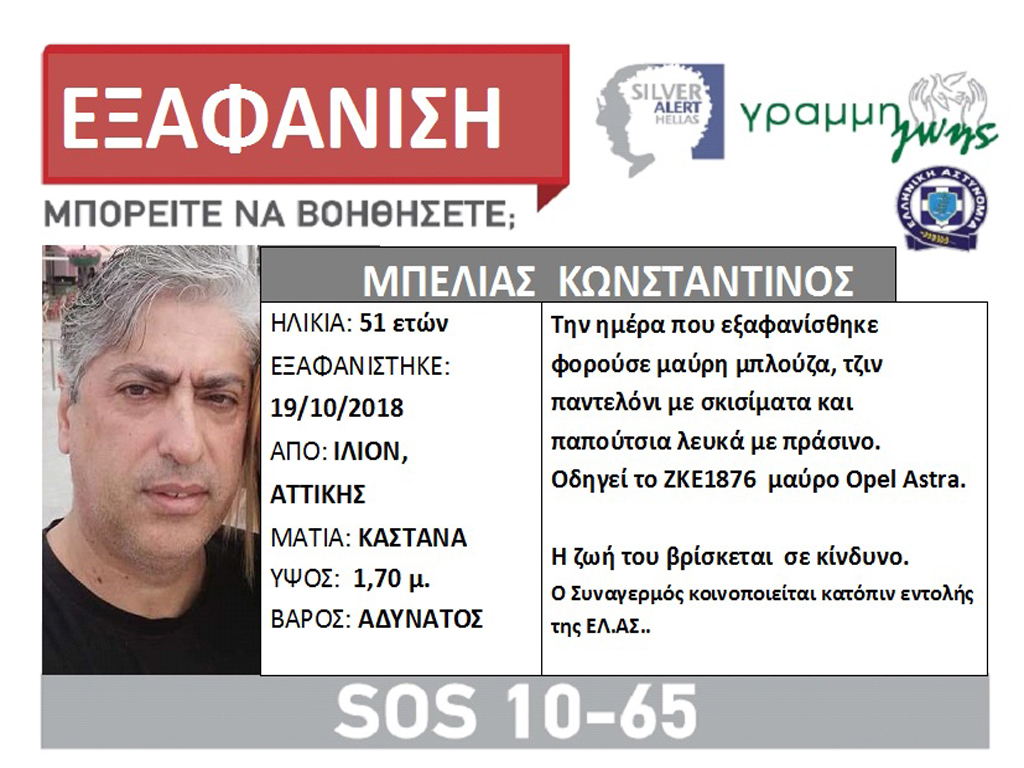 Ο Κωνσταντίνος Μπελιάς 51 χρόνων, χάθηκε με το αυτοκίνητο που οδηγούσε τα ξημερώματα της Παρασκευής 19 Οκτωβρίου. Πρόκειται για ένα μαύρο Opel Astra με αριθμό κυκλοφορίας ΖΚΕ 1876.