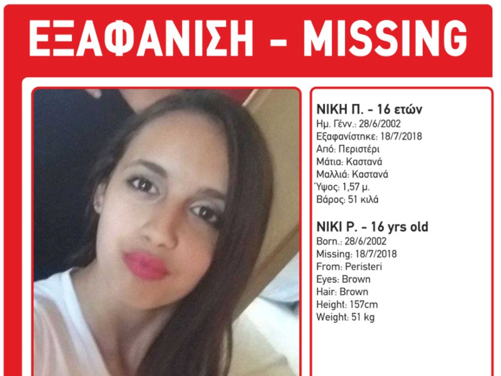 Συναγερμός έχει σημάνει για τον εντοπισμό της 16χρονης Νίκης Π. 16 η οποία εξαφανίστηκε από την περιοχή του Περιστερίου το πρωί της 18ης Ιουλίου.