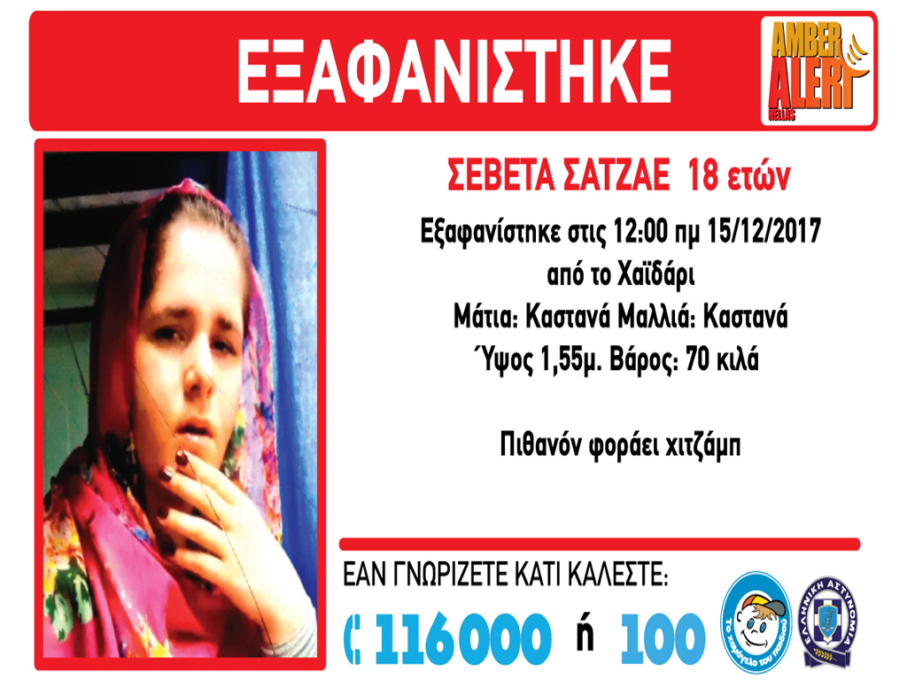 Σύμφωνα με το Χαμόγελο του Παιδιού που εξέδωσε σήμα Amber Alert, πρόκειται για την Σεβετά Σατζαέ.