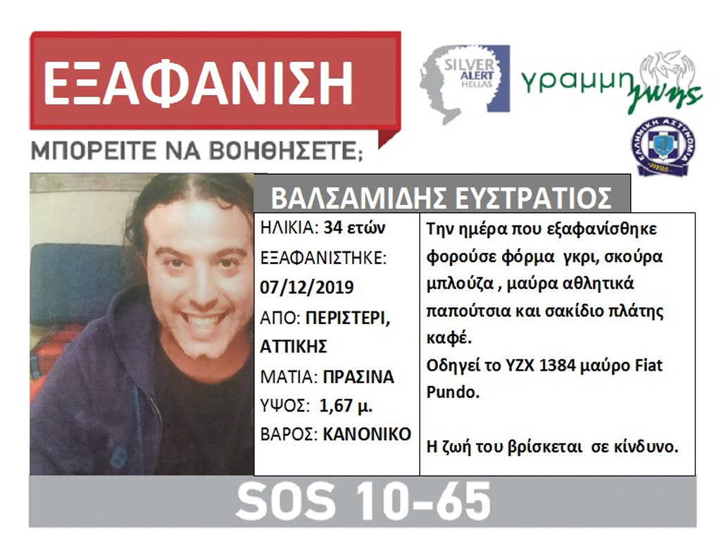 Μήνυμα συναγερμού για τον 34χρονο Ευστράτιο Βαλσαμίδη που εξαφανίστηκε στις 7 Δεκεμβρίου και έκτοτε αγνοείται εκδόθηκε σήμερα.