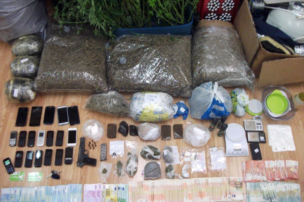 Σε έρευνες που έγιναν σε οικίες, συνολικά βρέθηκαν και κατασχέθηκαν περίπου 21 κιλά ακατέργαστης κάνναβης, 461 γραμμάρια κατεργασμένης κάνναβης, 152 γραμμάρια κοκαΐνης, 0,8 γραμμάρια MDMA, δέκα δενδρύλλια κάνναβης σε εργαστήριο υδροπονικής καλλιέργειας, το χρηματικό ποσό των 27.415 ευρώ, δύο ΙΧ αυτοκίνητα, μία μοτοσυκλέτα, ένα πιστόλι με γεμιστήρα και οκτώ φυσίγγια, τρία σπρέι παραλυτικού αερίου, 18 συσκευές κινητής τηλεφωνίας και πέντε ζυγαριές ακριβείας.