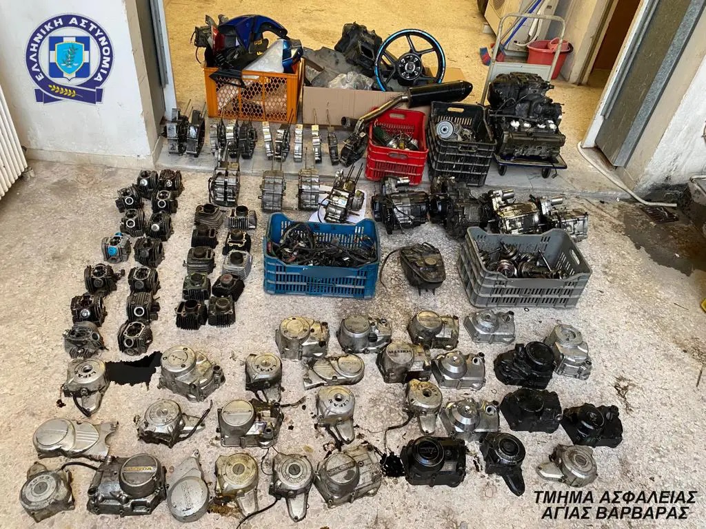 Το Τμήμα Ασφάλειας Αγίας Βαρβάρας της Υποδιεύθυνσης Ασφάλειας Δυτικής Αττικής προχώρησε στην εξάρθρωση εγκληματικής ομάδας-συμμορίας, τα μέλη της οποίας διέπρατταν κλοπές μοτοσικλετών, παραποιούσαν αριθμούς πλαισίων και κινητήρων σε παράνομο συνεργείο σε περιοχή της Αττικής και πωλούσαν τα μέρη τους αυτούσια ή τμηματικά – αποσυναρμολογημένα.