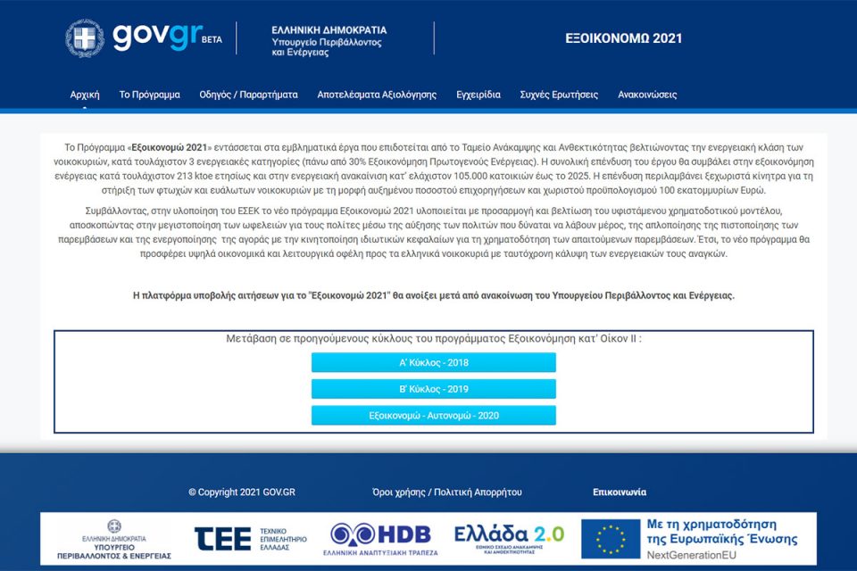 Διαθέσιμη είναι από σήμερα η ιστοσελίδα του «Νέου Εξοικονομώ» στον ιστότοπο exoikonomo2021.gov.gr για το πρόγραμμα που αναμένεται να προκηρυχθεί το Νοέμβριο.
