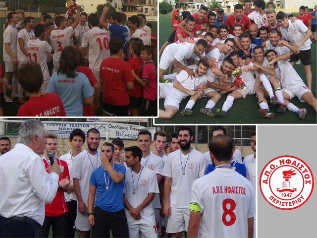 Πανηγυρικά γιόρτασαν την άνοδο στην Α’ κατηγορία της ΕΠΣΑ η Διοίκηση, το προπονητικό τιμ, οι παίκτες και οι φίλαθλοι του Ηφαίστου Περιστερίου μετά από μια καταπληκτική χρονιά στον 2ο όμιλο της Β’ κατηγορίας ΕΠΣΑ.