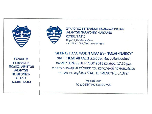 Ο Δήμος Αιγάλεω και ο Σύλλογος Βετεράνων Ποδοσφαιριστών – Αθλητών Παραγόντων διοργανώνουν τη Δευτέρα 22-04-2013 στις 17.30 Φιλανθρωπικό Αγώνα για την οικονομική ενίσχυση του Κοινωνικού Παντοπωλείου του Δήμου Αιγάλεω. Ο αγώνας μεταξύ των παλαιμάχων Αιγάλεω και Παναθηναϊκού θα διεξαχθεί στο Δημοτικό Γήπεδο Αιγάλεω «Σταύρος Μαυροθαλασσίτης».