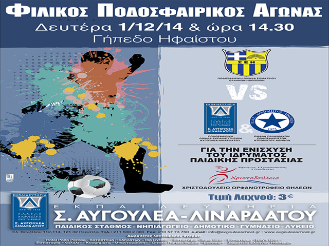 Με σκοπό την υποστήριξη του Χριστοδούλειου Ιδρύματος Προστασίας Παιδιών και στο πλαίσιο ποικίλων ανθρωπιστικών δράσεων που υλοποιούν τα Εκπαιδευτήρια Αυγουλέα-Λιναρδάτου και θα κορυφωθούν λίγο πριν τις Άγιες Μέρες των Χριστουγέννων, τη Δευτέρα 1/12/2014 και ώρα 14:30, στο Γήπεδο Ηφαίστου Περιστερίου «Γ. Βασιλόπουλος», διεξάγεται ένας σπουδαίος φιλανθρωπικός αγώνας ποδοσφαίρου ανάμεσα στα Εκπαιδευτήρια Σ. Αυγουλέα-Λιναρδάτου και το Σωματείο Ελλήνων Ηθοποιών.