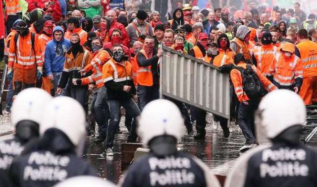 Διαδηλωτές κατέλαβαν νωρίτερα την έδρα του συνδέσμου βιομηχάνων του Βελγίου και στη συνέχεια άρχισαν να συγκρούονται με την αστυνομία.