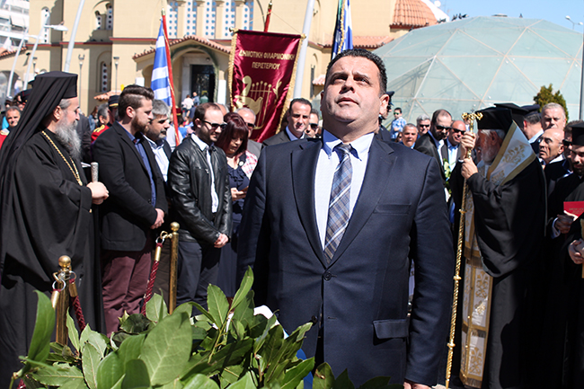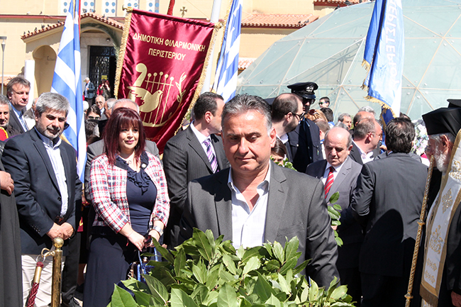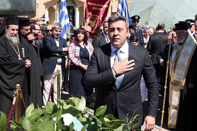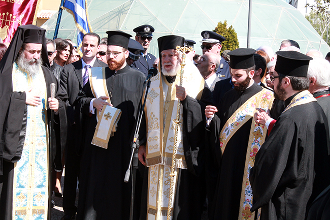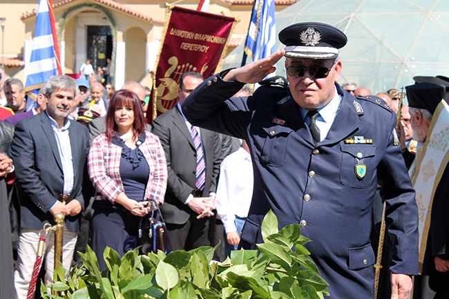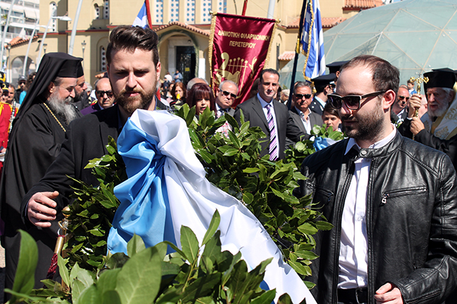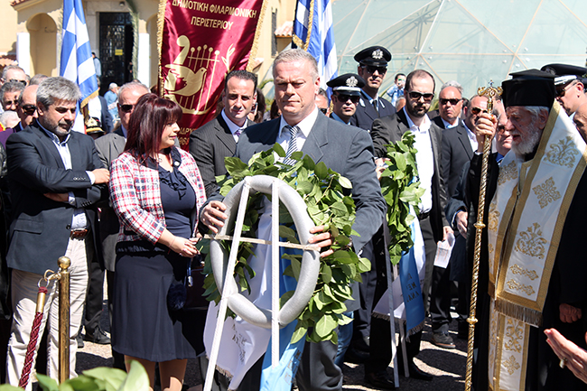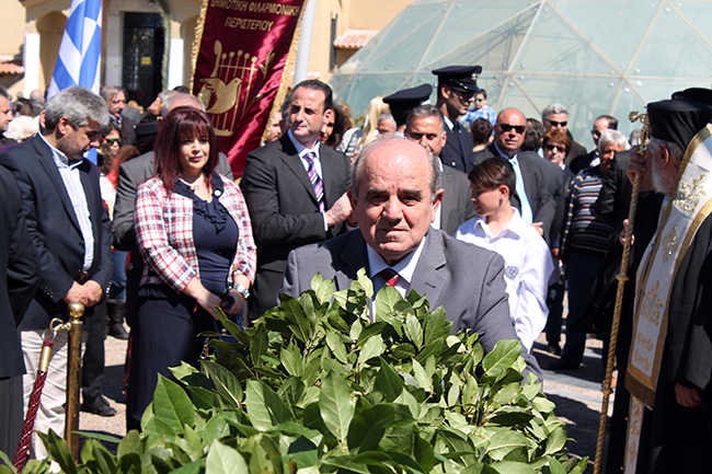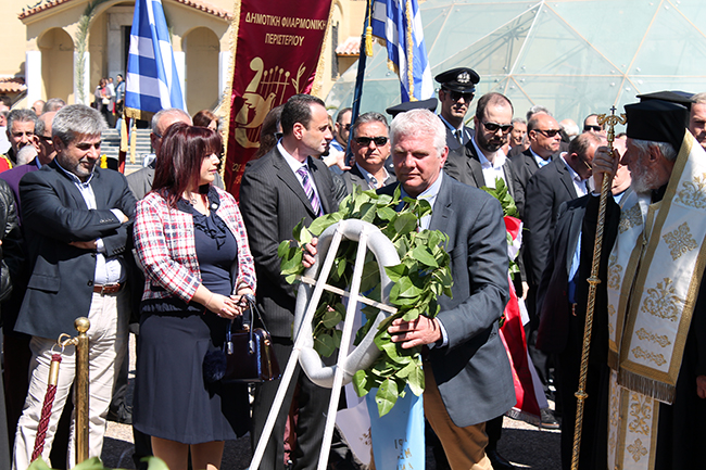 Πριν την κατάθεση στεφάνων τελέστηκε η επιμνημόσυνη δέηση από τον Σεβασμιότατο Μητροπολίτη Περιστερίου κ.κ. Χρυσόστομο.