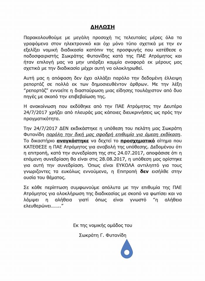 Τη δική του απάντηση αναφορικα με την εν εξελίξει αντιδικία του με την ΠΑΕ Ατρόμητος έδωσε η νομική πλευρά του Σωκράτη Φυτανίδη, με τον κεντρικό αμυντικό να ενημερώνει για αυτή μέσω του προσωπικού του λογαριασμού στο Facebook.