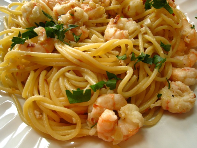 – Τέλος βάζουμε τα μακαρόνια σε μια πιατέλα και περιχύνουμε αυτά με τις γαρίδες και απο πάνω τον φρέσκο ψιλοκομμένο μαιντανό.