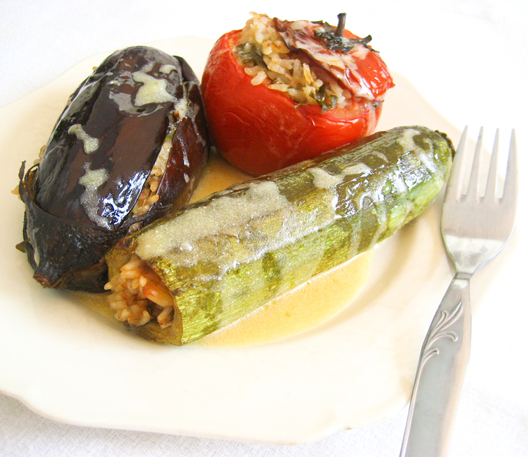 - Έχουμε τοποθετήσει εντωμεταξύ τα λαχανικά σε ένα ταψί στο οποίο μπορούμε να προσθέσουμε και πατατούλες. Σ΄αυτή την φάση μπορούμε να προσθέσουμε στο μείγμα του ρυζιού τριμμένη φέτα ή κομματάκια κεφαλοτύρι. Γεμίζουμε. Από πάνω ρίχνουμε φρυγανιά τριμμένη και ελαιόλαδο και λίγο νερό.