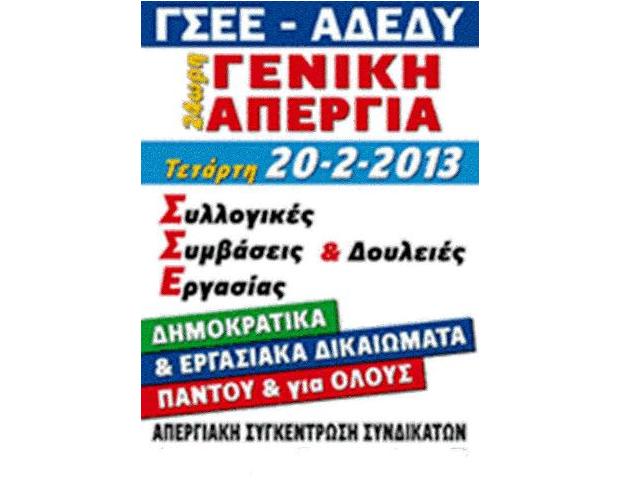 Παραλύουν σήμερα δημόσιος και ιδιωτικός τομέας, στο πλαίσιο της 24ωρης απεργίας την οποία έχουν κηρύξει ΓΣΕΕ και ΑΔΕΔΥ.